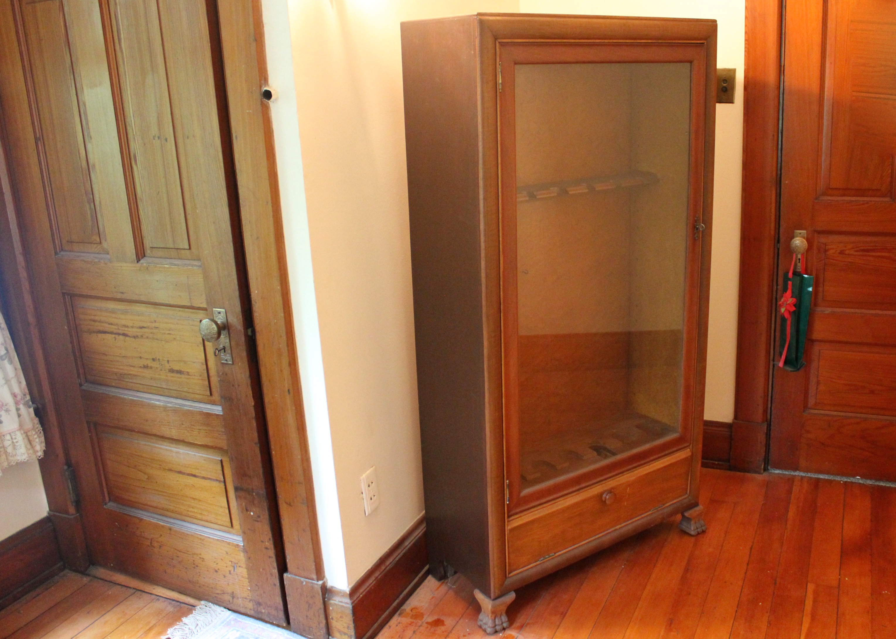 One adjustable shelf inside each bottom door. Our gun cabinets are assembled using superior fasteners and adhesive. Vintage antique bookcase converted to gun cabinet cherry or mahogany. You must remember that oak furniture back then was the poor man's wood. Shown with optional tongue & groove solid wood back.